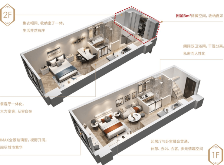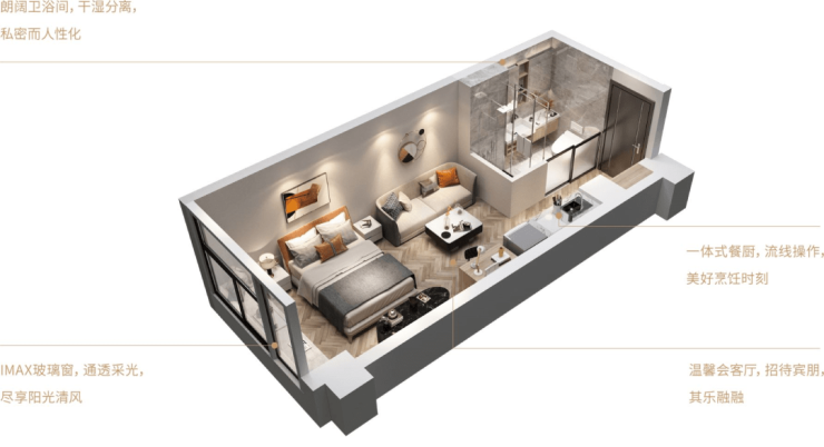 • 起居厅与卧室融会贯通,休憩、办公、会客