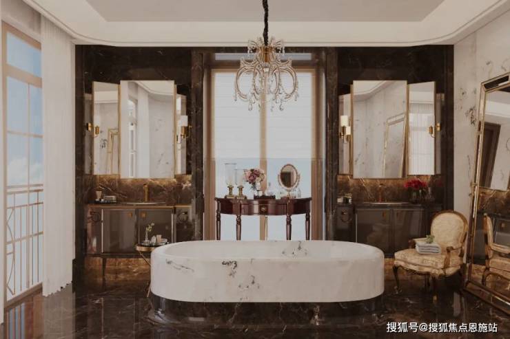 秩序,是主卫浴空间布局的重点。两个独立台盆相对而立,分属男女主人,营造出从容自如的使用体验。大面积运用黑白撞色大理石,让空间的秩序美与材质的自然美融合,颇具观赏韵味。
