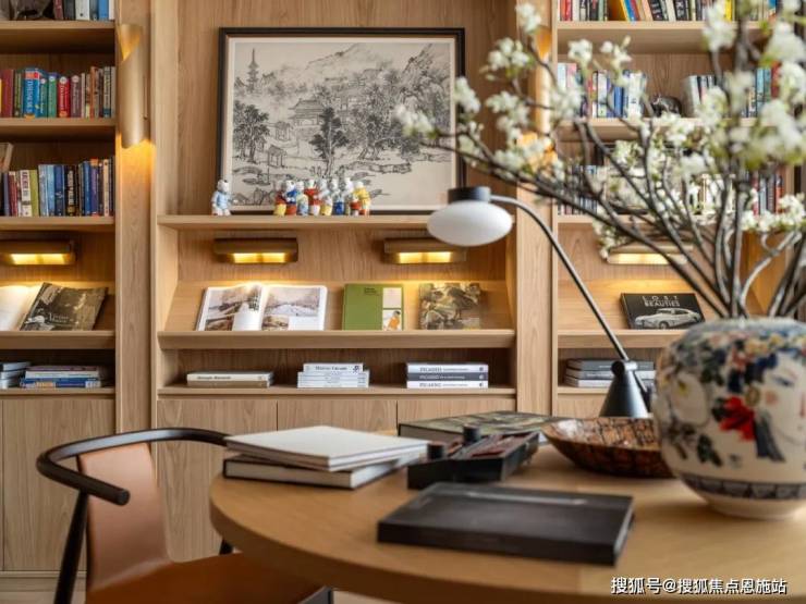 书房色调沉稳大气,精心设计的柔和灯光突显书香气韵,吸引人们长久驻足,于宁静的氛围中品味知识的力量。