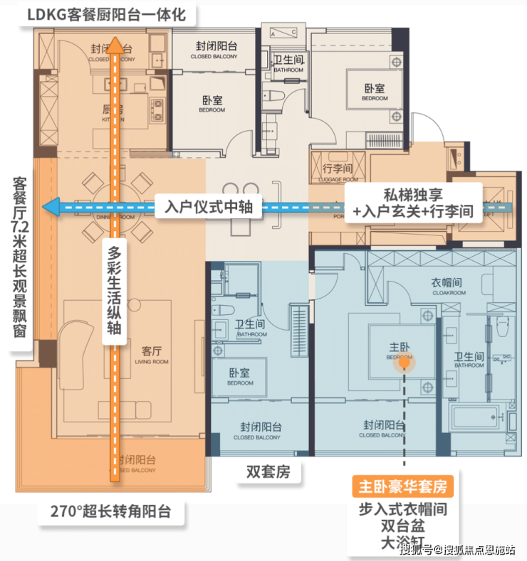 户型采用“LDKG”客餐厨阳台一体化新型空间理念,四大公区保持在一条直线上,家人在下厨、用餐和客厅活动的全面融合,完成社交、聚会、亲子等升华“家”之意义的所有需求。约15米的超大南向四面宽,约5米×1.6米景观大阳台,把阳光更大限度地引入室内;双阳台设计、小家化星级套卧,化妆间、衣帽间一应俱全,向别墅级居住体验进取,用精工平层开启城市新豪宅主义的新思路,将风景照进生活。