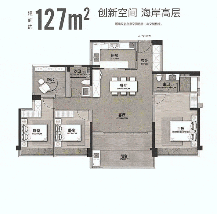 约127㎡阔绰四房,海岸高层,创新LDKG客餐厨阳台一体化设计,约60㎡的家庭社交场所,满足社交派对、家庭聚会,主次卧分离、星级套房设计、独立衣帽间,家人各有空间,约15米四开间朝南,房子尽享清风、阳光。