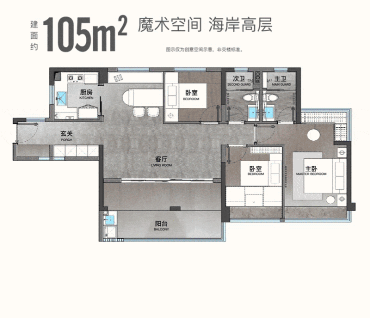 约105㎡百变3+1房,5.7米巨幕厅,更多灵动空间任意拓展,轻松打造开放式书房或儿童玩乐区,甚至家庭健身区,可满足二人世界、二胎家庭、三代同堂。南北对流,房子通透明亮,主卧小家化,步入式衣帽间一应俱全,自成小天地。