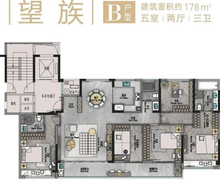 占据“观景C位”的178㎡,无论南北视野都是园区的极致风景。 从南向巨幕阳台向外望去,是 承载孩子无限欢乐的【淘气转角】。从北侧的书房眺望园区,能够看到 一汪克莱因蓝景观池,承载高阶生活的向往。丰富的中轴景观带,移步一景的景观呈现,给与未来业主丰盈的生活体验。