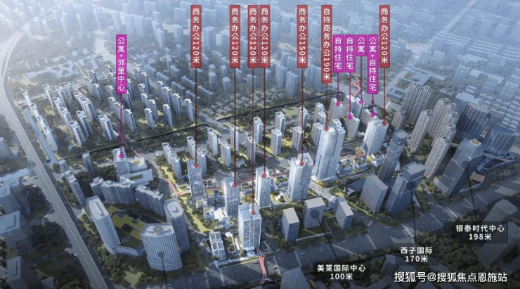 七座以“奇山峻峰”为主题设计的超高层写字楼由北至南一字排开,尤其是位于南苑街南北两侧的 高达190米和150米的双子摩天楼,将使临平CBD核心的天际线更加饱满,南北纵穿地块的商业街区,连接起两端银泰城和欢乐城两大商业综合体,商业氛围也将更加浓厚。