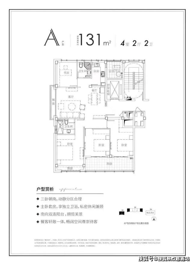 建面约131平方米四房两厅两卫户型,三开间朝南。主卧为套房设计,带独卫和飘窗