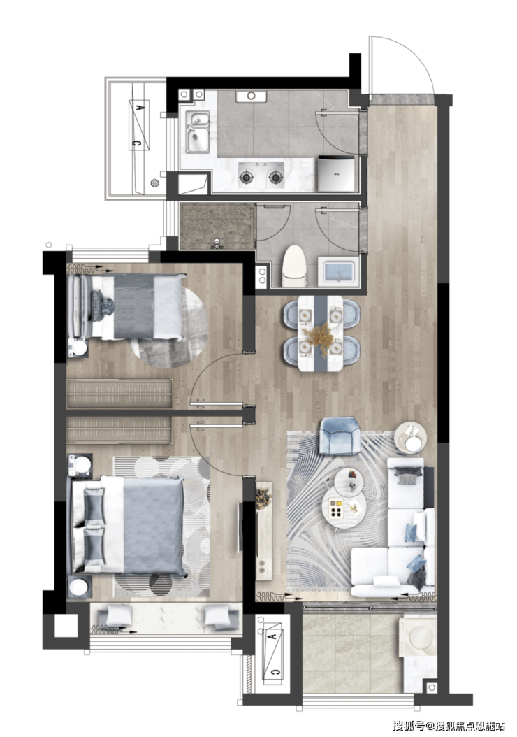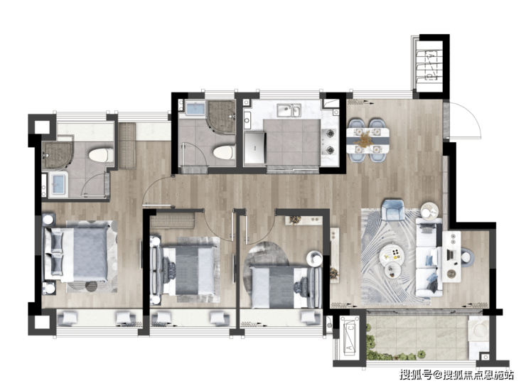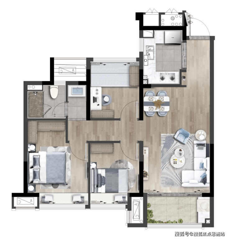 该户型各功能间尺度更舒适也更均衡,是一个能让三口之家真正一步到位的户型;