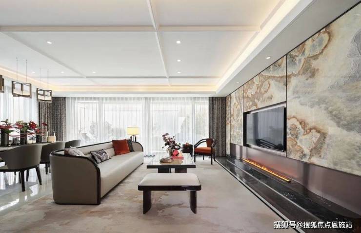 地下空间,以古时的「雅集」为灵感,打造了一个氛围柔和舒适的休闲娱乐空间,挑空的设计,让空间显得大气非凡,顶面延续了之前紫禁明月中的方格金箔顶,墙面的大块水墨玉石,宛若矗立山林间。