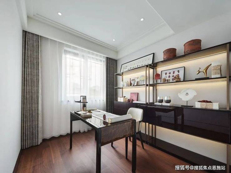 主卧一旁的多功能房设置书房,营造出书香门第的文化氛围。人在其中才不会心浮气躁。传统中式书房从陈列到规划,从色调到材质,都表现出雅静的特征,因此也深得不少现代人的喜爱。在现代家居中,拥有一个「古味」十足的书房、一个可以静心潜读的空间,自然是一种更高层次的享受。