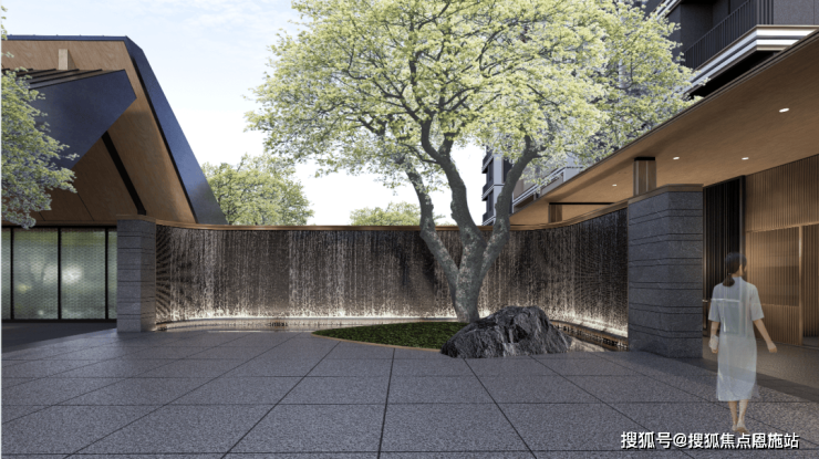 进入园区,迎面还有一处 约450㎡的琉璃水院,造价约200万,三阶叠水每阶落差约15-20厘米,遍布涌泉树池。