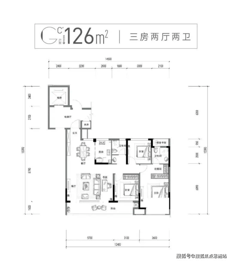 在“小而奢”的演绎里,以建面126㎡的空间设计为例。除了三房设计外, 更是以3+1开间的格局,搭配客厅约6米大横厅,外接南向双阳台,演绎宽幕风景!