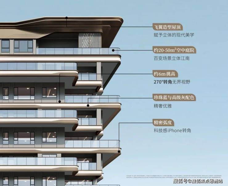 项目的空中庭院面积达到了 20-50㎡ ,约6m挑高,最大可享270°转角无界视野,真正实现每层每户,都享受独家大花园!